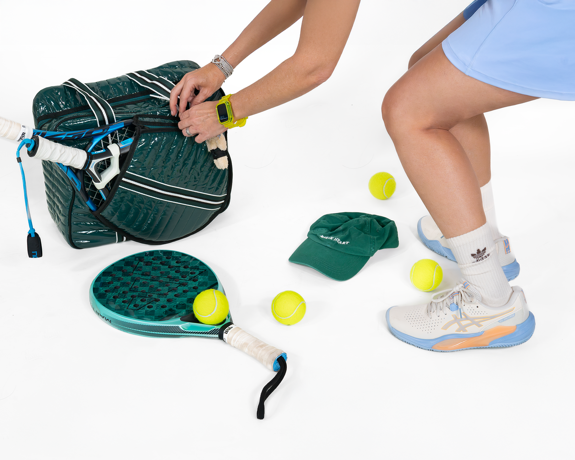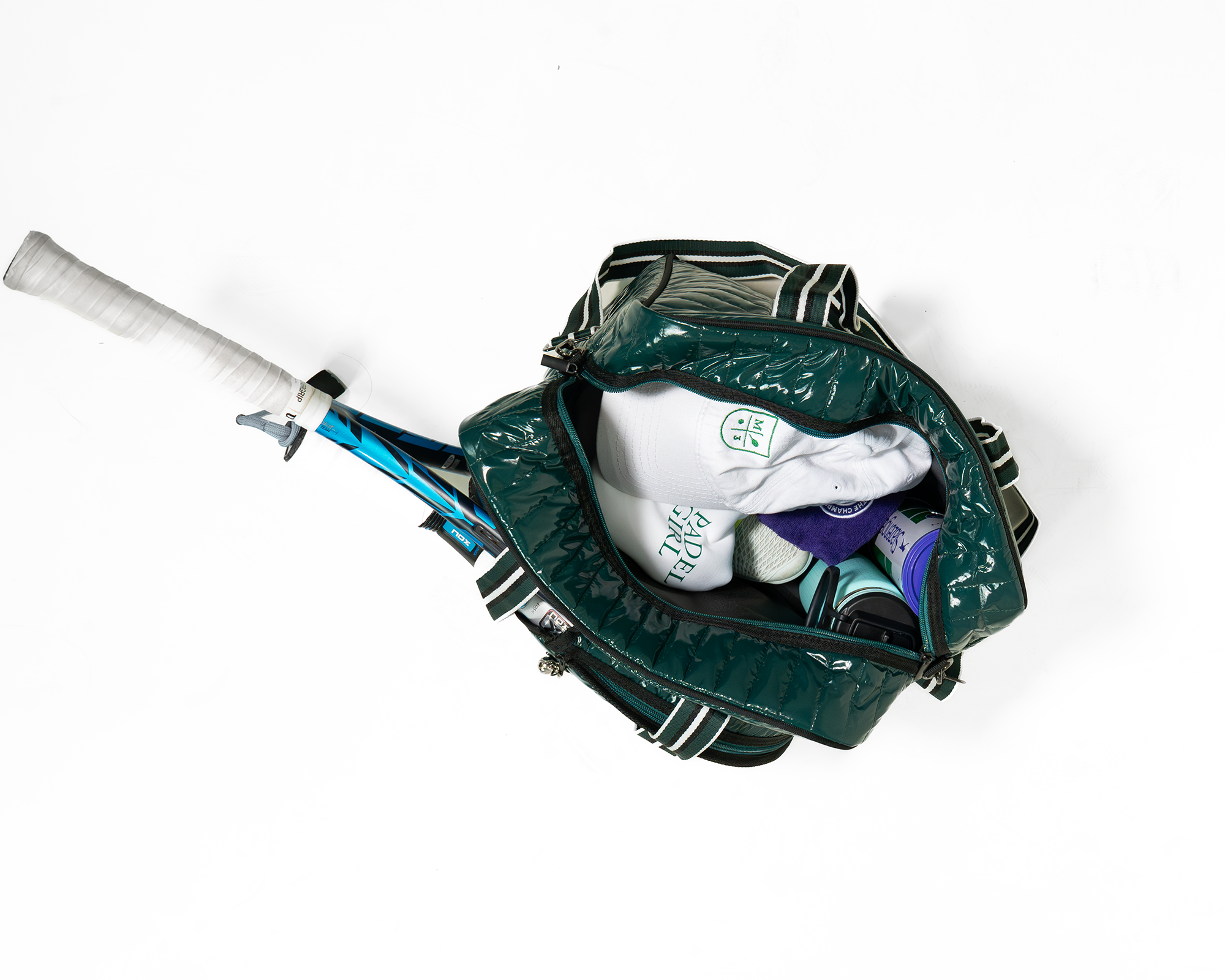 Fabricada en material acolchado de acabado brillante, cuenta con amplio espacio interior y compartimentos funcionales para guardar raquetas, pelotas, toalla y todo lo que necesitas para tu rutina deportiva.
